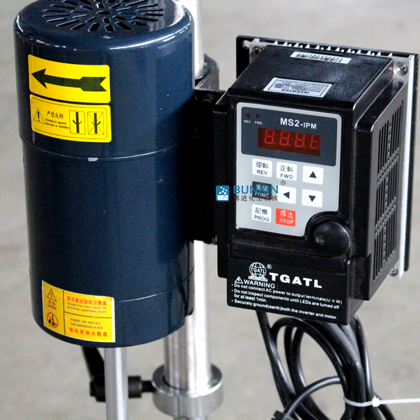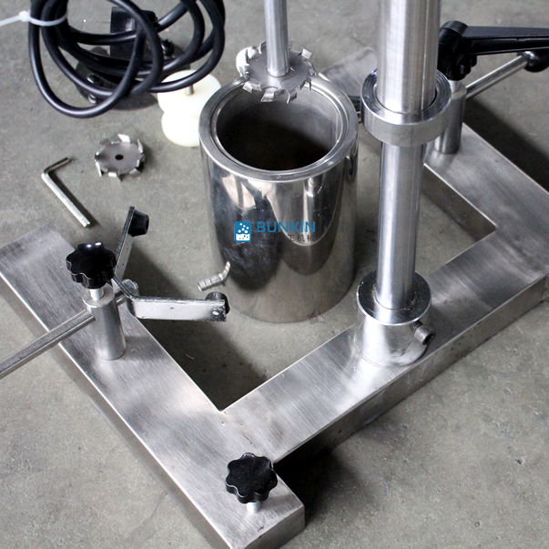 設(shè)備帶有鎖緊及升降手柄,能夠快速升降和固定;分散盤采用內(nèi)六角螺栓與主軸固定,能夠方便快速拆卸更換,清洗容易;帶有夾桶裝置,可以快速將攪拌桶固定,防止桶在工作中發(fā)生位移造成安全事故。