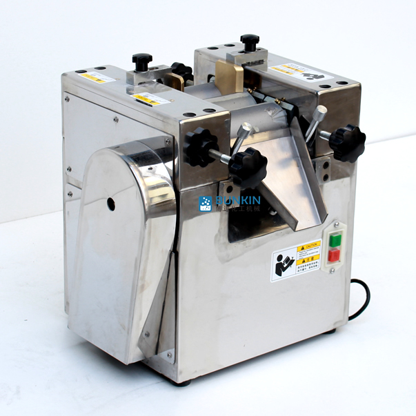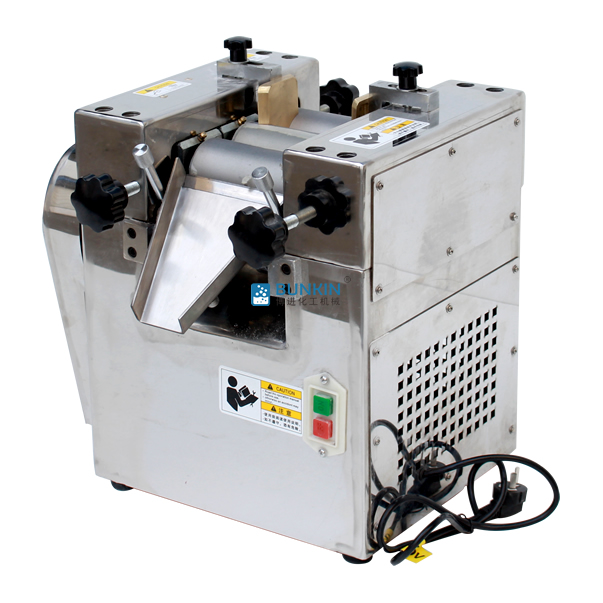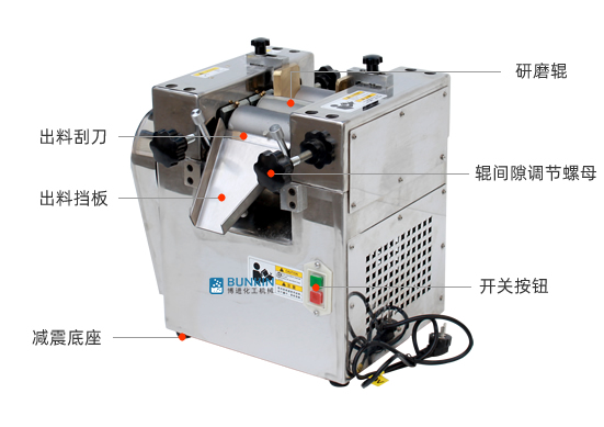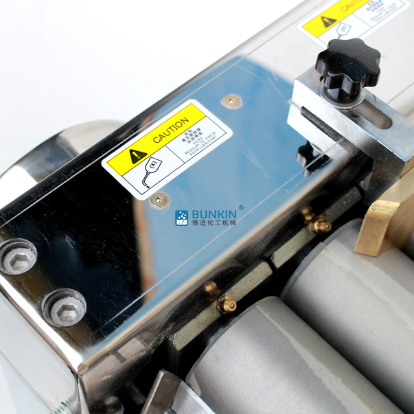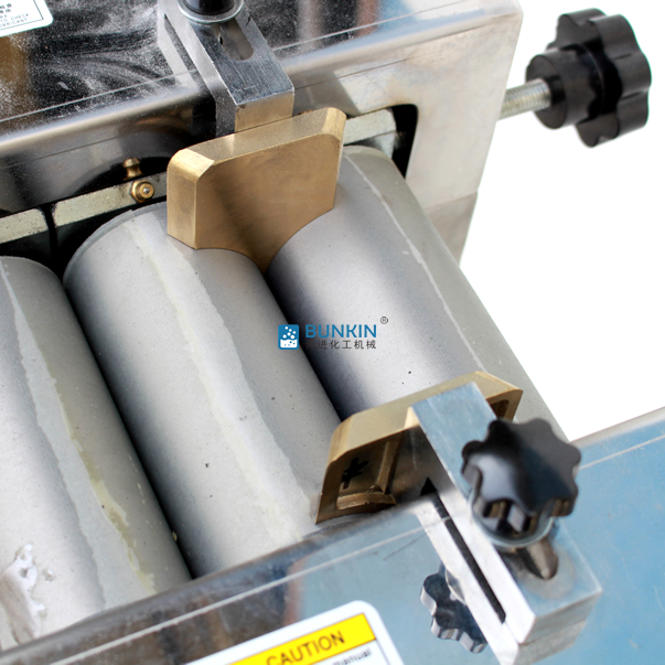 實驗室三輥研磨機由三個輥筒組成,裝在一個機架上,由電動機直接帶動。一般輥筒間的轉動方向不同,前輥向前轉動,中輥向后轉動。輥子轉速前輥快、后輥慢。中間輥固定,前后兩輥裝在滑道上,有彈簧裝置,用手輪調節前后輥與中輥的距離。物料由后輥與中輥之間進入,受到輥筒的擠壓,產品顆粒變細,然后由快輥帶出,快輥末端裝有刮刀,使物料與輥筒分離,落入收集桶內。