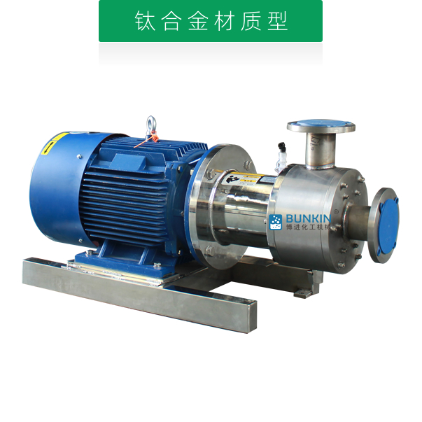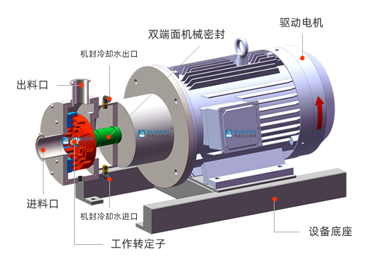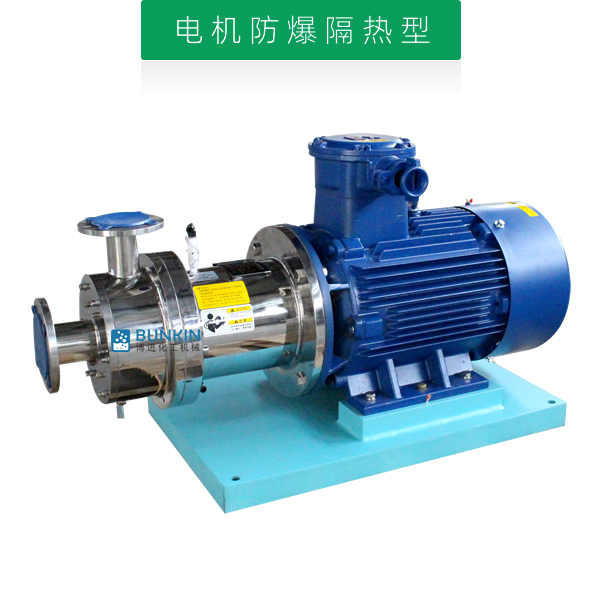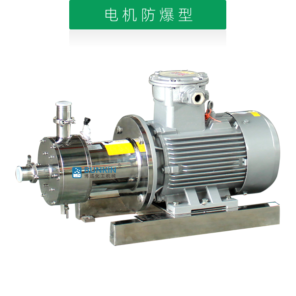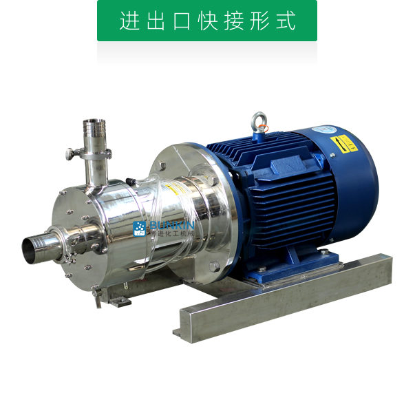 單級乳化泵采用臥式結構。在狹長的工作腔內裝有一組轉定子,轉定子可設計成單級兩層或者單級六層結構,轉定子對偶耦合。由電機帶動中間軸進行高速運轉,轉定子形成真空,物料從進口被吸入轉定子腔內,強大動能使轉子產生極高的線速度,使物料在轉、定子間隙之間經過強烈的撞擊、破碎、離心擠、液層摩擦、強力剪切之后飛射出去,在多種不同方向力的作用下,產生強大紊流,物料從出口流出。并可根據工藝要求進行多次循環處理。