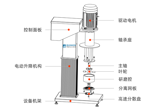 籃式研磨機工作時由電機運轉帶動撥桿和底部分散盤高速旋轉,使分散盤上部及籃腔內部形成真空,漿料被吸入籃式研磨腔內。撥桿驅動腔內的研磨介質產生向各個方向的力,物料中的顆粒受到介質不斷地碰撞及摩擦,粒徑變小,粒徑范圍變窄;分散盤的高速運轉,產生渦流將腔內物料抽吸出來,再循環至進料,具有非常顯著的分散研磨混合效果。