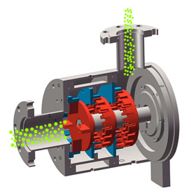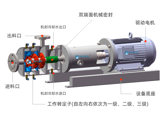 高頻粉碎乳化石灰泵是用于連續生產或循環處理石灰乳的新型工藝設備,在狹窄的腔體內,裝有三組對偶咬合的多層定、轉子,高速旋轉的轉子將物料迅速吸入轉子腔內,由于轉子高速旋轉所產生的高圓周線速度和高頻機械效帶來的強勁動能,在特殊的定子腔中形成高低壓循環交替的高頻震蕩效果,石灰乳受到強烈的機械及液力剪切、離心擠壓、液層摩擦、撞擊撕裂和湍流等綜合作用,從而使不相溶的固相、液相在相應成熟工藝的共同作用下、瞬間均勻精細的破碎、乳化,經過高頻的循環往復,承受強烈的剪切、破碎、乳化、分散作用,得到穩定的石灰乳。