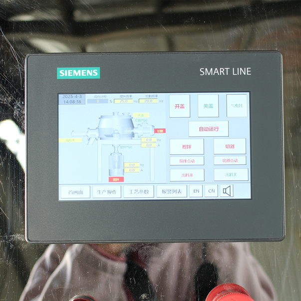 設備帶有智能化觸摸屏,?具有實時監控與參數顯示等功能,支持一鍵啟停、參數調整(如開蓋、轉速、出料等)